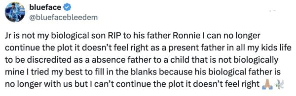 “Jr is not my biological son RIP to his father Ronnie I can no longer continue the plot it doesn’t feel right as a present father in all my kids life to be discredited as a absence father to a child that is not biologically mine I tried my best to fill in the blanks because his biological father is no longer with us but I can’t continue the plot it doesn’t feel right