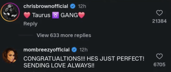 In a fittingly cheeky twist, one of the newborn snaps appears to show the little one flipping off the camera, making for what some online are calling a very “Breezy-coded” debut.