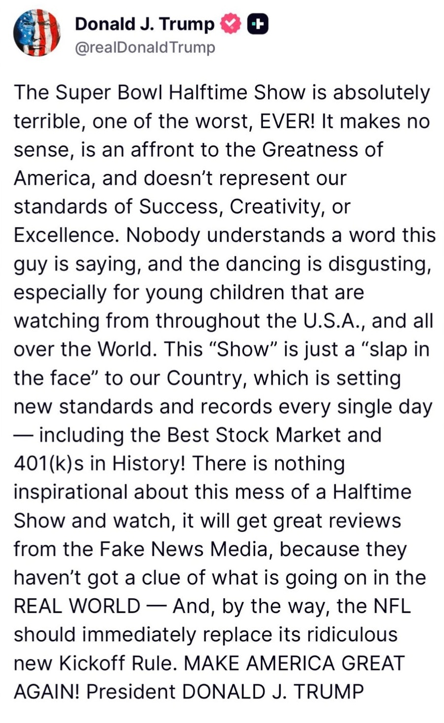 “The Super Bowl Halftime Show is absolutely terrible, one of the worst, EVER! It makes no sense, is an affront to the Greatness of America, and doesn’t represent our standards of Success, Creativity, or Excellence. Nobody understands a word this guy is saying, and the dancing is disgusting, especially for young children that are watching from throughout the U.S.A., and all over the World. This “Show” is just a “slap in the face” to our Country, which is setting new standards and records every single day including the Best Stock Market and 401(k)s in History! There is nothing inspirational about this mess of a Halftime Show and watch, it will get great reviews from the Fake News Media, because they haven’t got a clue of what is going on in the REAL WORLD – And, by the way, the NFL should immediately replace its ridiculous new Kickoff Rule. MAKE AMERICA GREAT AGAIN! President DONALD J. TRUMP.”