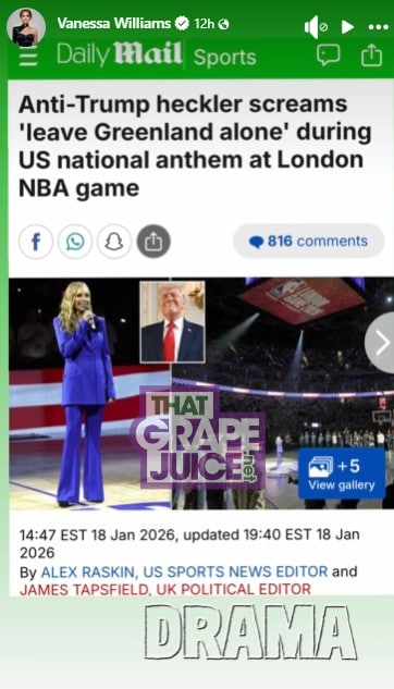 With nearly 40 years in the music business, one doesn’t get to Vanessa Williams‘ stature in the entertainment industry without being a consummate pro – especially under pressure. In case a reminder was needed, it was served Sunday (January 18) when her stirring performance of the U.S. national anthem was interrupted by a heckler ahead of the NBA’s London game between the Memphis Grizzlies and Orlando Magic. » Read more about: “Drama!”: Vanessa Williams Reacts to Viral Video of Anti-Trump Heckler During Her NBA National Anthem Performance » The post “Drama!”: Vanessa Williams Reacts to Viral Video of Anti-Trump Heckler During Her NBA National Anthem Performance appeared first on ..::That Grape Juice.net::.. - Thirsty?.
