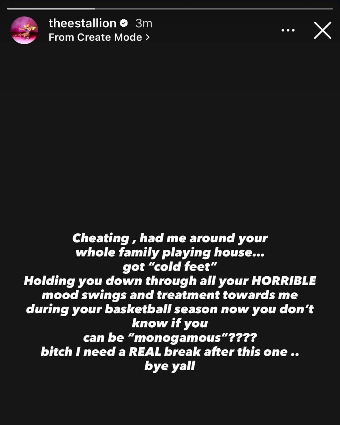 “Cheating, had me around your whole family playing house… got ‘cold feet.’ Holding you down through all your HORRIBLE mood swings and treatment towards me during your basketball season, now you don’t know if you can be ‘monogamous’????”
