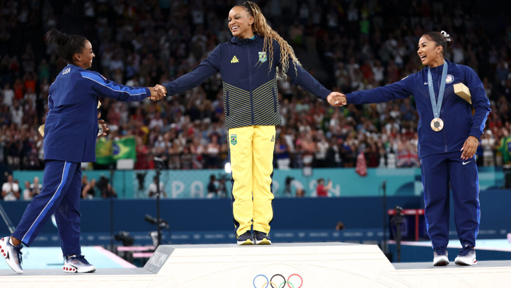 Referencing the moment she shared the podium with fellow champions Simone Biles and Rebeca Andrade, creating the first all-Black Olympic gymnastics podium in history, the UCLA senior added, “I fight for that historic all-Black podium. A moment that was etched into the hearts of everyone who witnessed it. It is a powerful reminder that when our world seems chaotic and our future uncertain, the spirit of the Olympic Games can be a beacon to guide us back to humanity.”