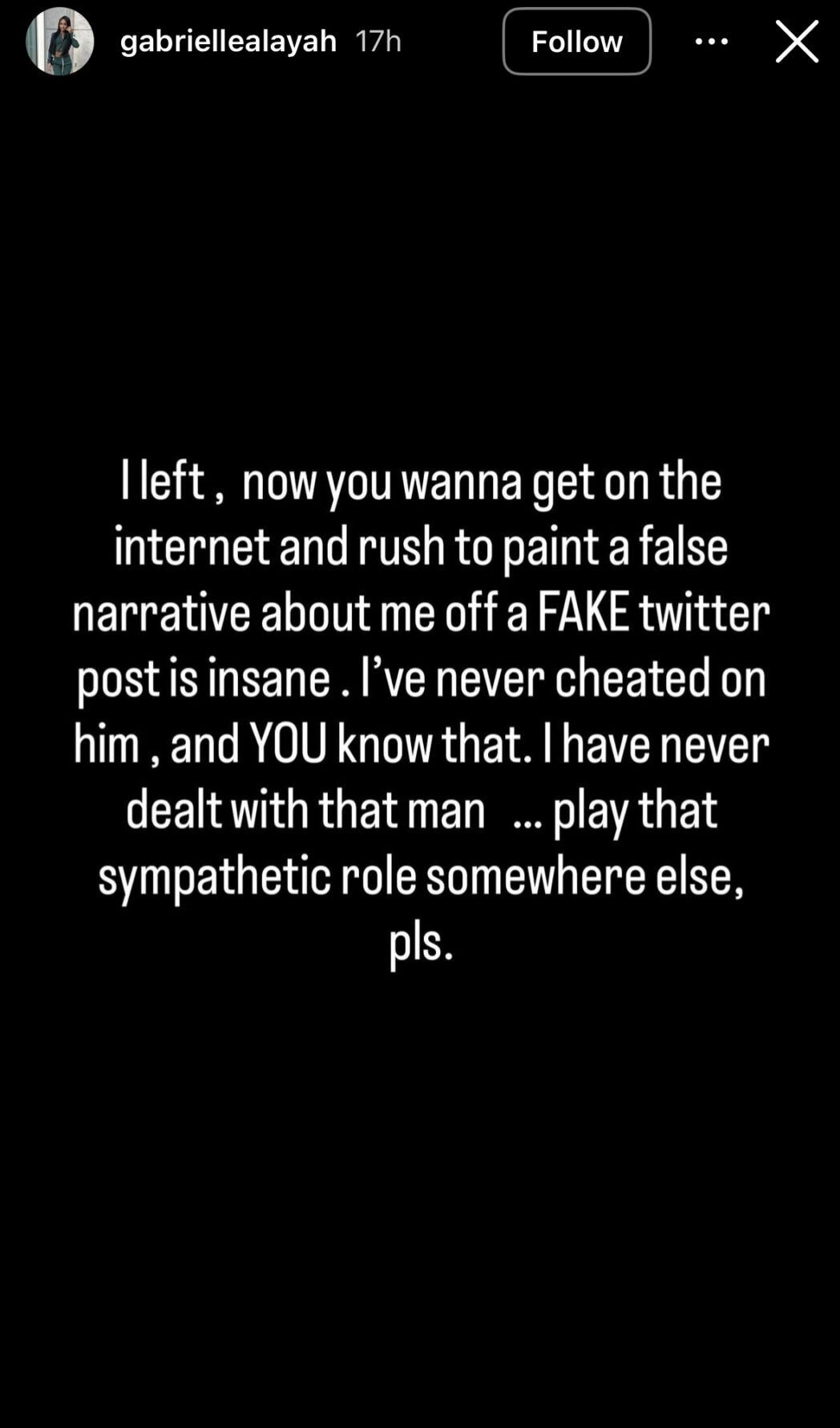 “I left, now you wanna get on the internet and rush to paint a false narrative about me off a FAKE twitter post is insane,” she wrote on Instagram. “I’ve never cheated on you, and YOU know that. I have never dealt with that man… play that sympathetic role somewhere else. pls.”