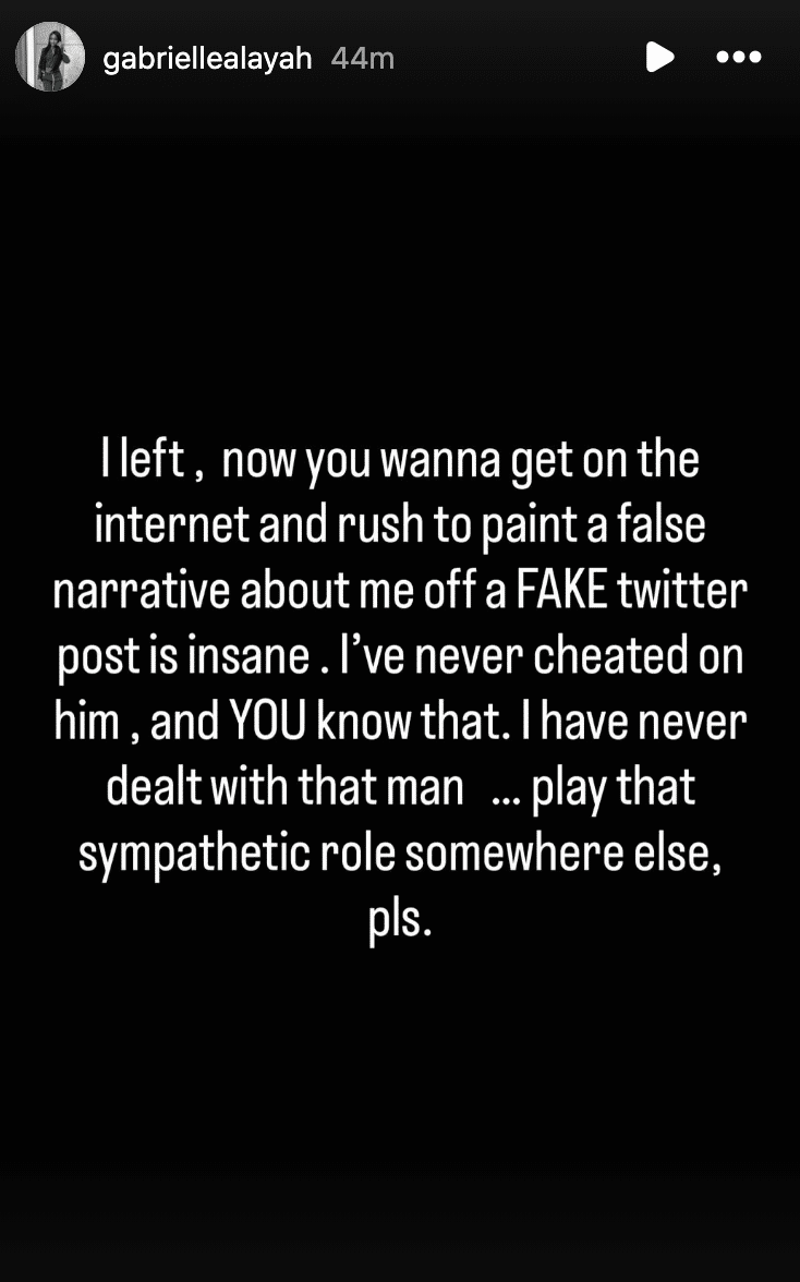 Not long after, Alayah responded via Instagram Stories, accusing someone of rushing online to push “a false narrative” based on a “FAKE twitter post.”