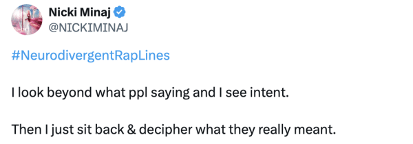 Minaj, who has been increasingly vocal about her political views, would go on to share more under the hashtag: #NeurodivergentRapLines: