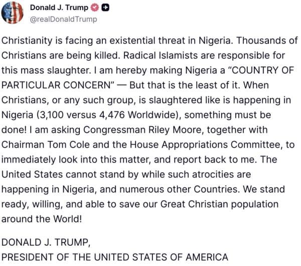 Taking to X, the femcee reshared a post from Trump venting about “Christianity facing an existential crisis in Nigeria” and “radical Islamists” being “responsible for mass slaughter.”