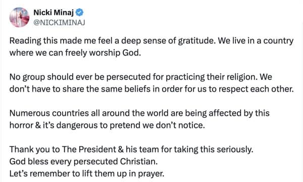 Nicki Minaj has expressed public support for Donald Trump after the U.S. President spoke up about the “threat to Christianity” in Nigeria.