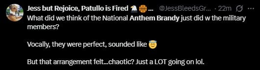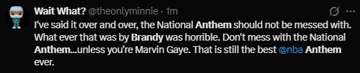 ‘Top of the World’ hitmaker Brandy found herself on top of X (formerly known as Twitter) trending topics list on Sunday night (February 15) after dividing viewers of the NBA All-Star Game on her performance of the U.S. national anthem ahead of the big event’s kick off. View this post on Instagram » Read more about: Ouch! Brandy IGNITES Social Media Debates After Conservatives SLAMMED Her “Unrecognizable” National Anthem at the NBA All-Star Game » The post Ouch! Brandy IGNITES Social Media Debates After Conservatives SLAMMED Her “Unrecognizable” National Anthem at the NBA All-Star Game appeared first on ..::That Grape Juice.net::.. - Thirsty?.