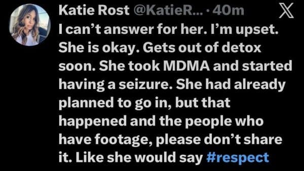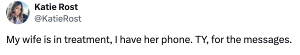In a surprise move, Rost’s husband took to her X account to announce that she is currently in “treatment.”