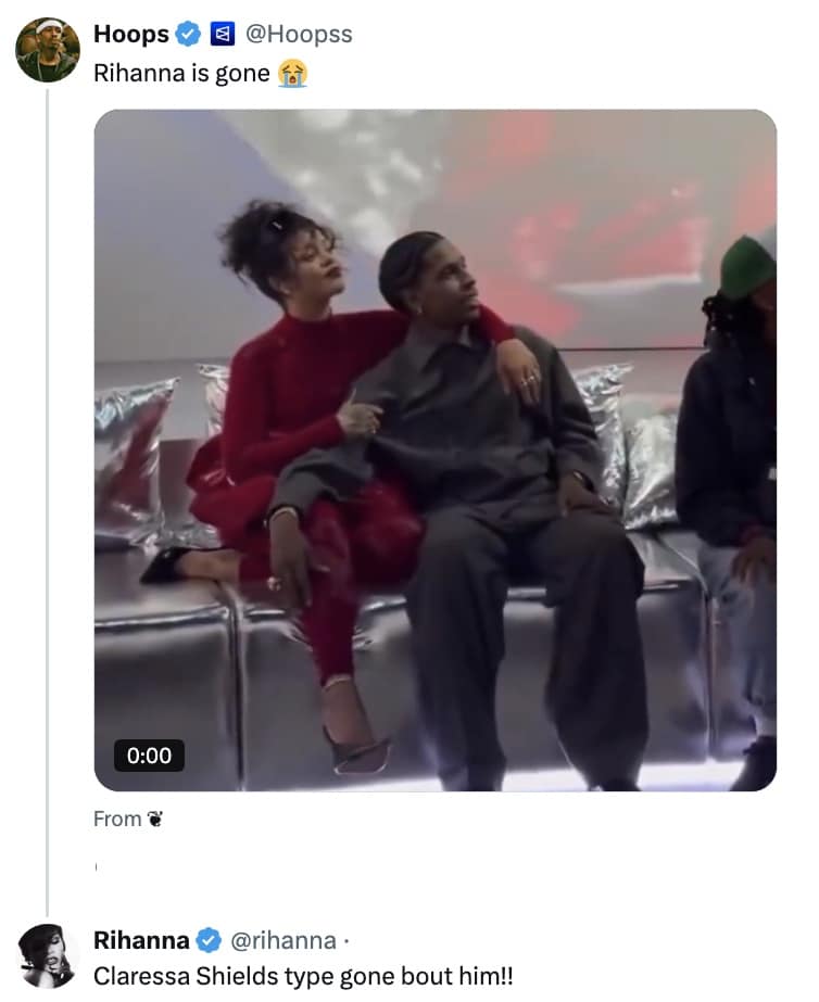 A fan took to X to share a clip of RiRi loved up with the rapper, writing “Rihanna is gone.”