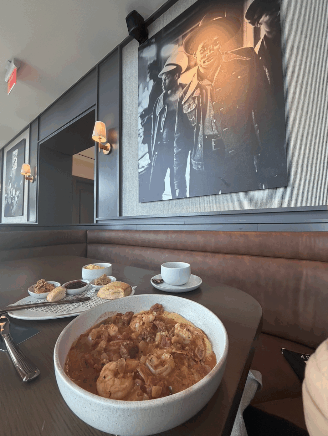 Downstairs boasts Elevation Cafe—upstairs, the AYA Soulful Dining restaurant steals the show for breakfast, lunch, or dinner by fusing African American soul food with flavors from the Caribbean and the mother continent. During our visit, my favorite meal was AYA’s shrimp and grits, a savory, delicious fusion of flavors worth boarding a plane to taste. AYA’s freshly made biscuits with custom jams, including sweet potato butter, are light and delightful. The cocktails are artful, and the service is top tier, with each hostess and server greeting guests with warmth that defines Southern hospitality. Matching the style and design of the rest of the hotel, AYA also features art by Black painters, sculptors, and artists intentionally placed throughout the restaurant.